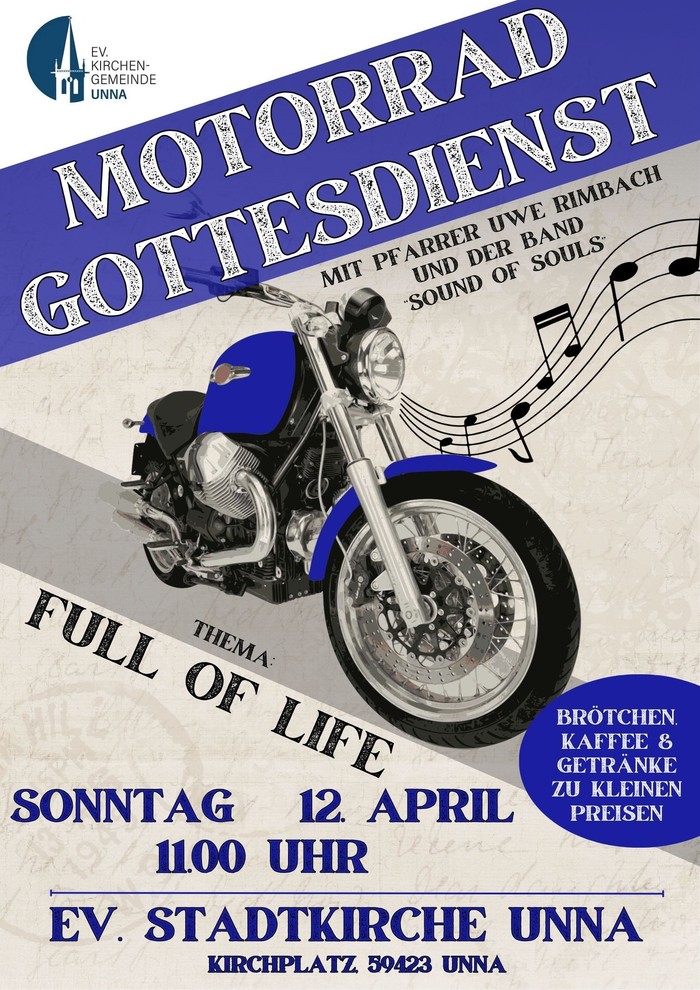 Am Sonntag, dem 12.4.2026, um 11.00 Uhr, findet diesmal wieder auf dem Platz vor der Ev. Stadtkirche Unna der schon traditionelle Motorrad-Gottesdienst statt. Unter der Überschrift „Full of Life“ werden wir uns an diesem Tag mit Musik, Gebet und Texten innerlich auf die vor uns liegende Motorradsaison vorbereiten. Wir werden der verstorbenen und im Straßenverkehr getöteten Biker und Bikerinnen gedenken und Gott um seinen Segen für die vor uns liegenden Kilometer bitten. Speisen und Getränke geben im Anschluss an den Gottesdienst die Möglichkeit zum Kennenlernen und zu reichlich Benzingesprächen. Hierzu sind alle Biker und Bikerinnen mit ihren Motorrädern herzlich eingeladen. Sollte das Wetter wieder aller Erwartung regnerisch sein, werden wir den Gottesdienst in die Kirche verlegen.